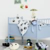 La plupart des articles sont certifiés coton bio GOTS. Tous les tissus et fils sont teints ou imprimés avec des encres ne nuisant pas à l’environnement, et le bois provient de plantations MDF. Tous les jouets en bois sont peints avec de la peinture non toxique.